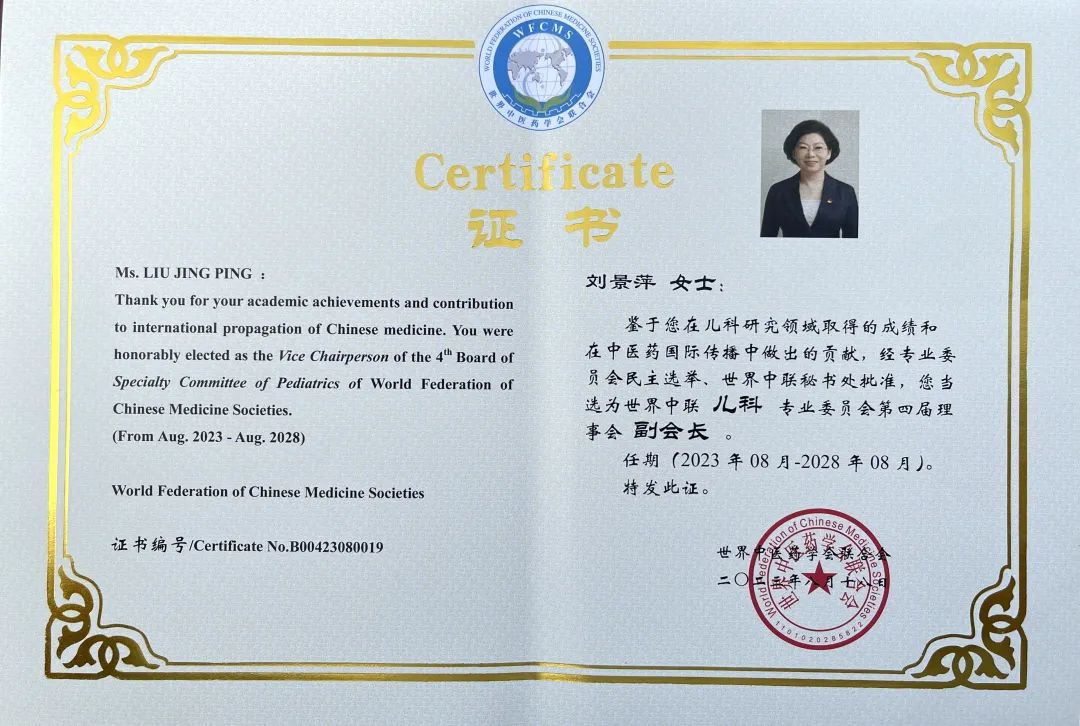 龙八国际药业集团党委书记、董事长刘景萍当选世界中医药学会联合会儿科专业委员会第四届理事会副会长